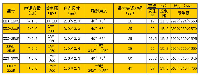 XXG—1605型、XXG—2005型、XXG—2505型、XXG—3005型探傷機均為波紋陶瓷管定向輻射探傷機XXGH—2505型、XXGH—3005型為波紋陶瓷管周向輻射探傷機,其最大的特點是X射線管采用電壓高、體積小、性能穩定、壽命長的波紋陶瓷管,從而使X射線發生器的體積更小,重量更輕,在使用壽命和抗震方面優于其它種類的X射線探傷機。